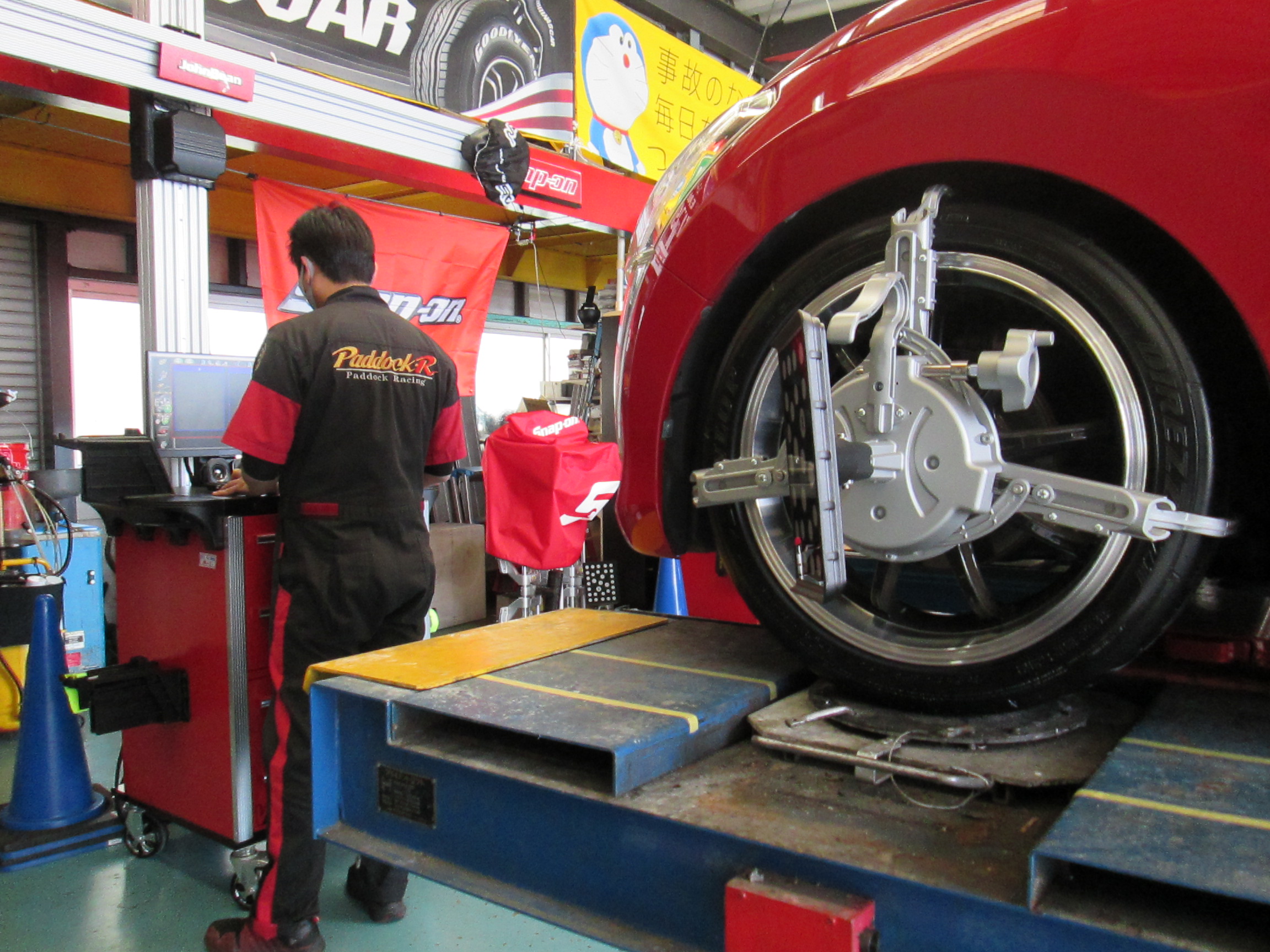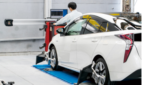 先進技術3Dホイールアライメントを用いた検査・調整風景