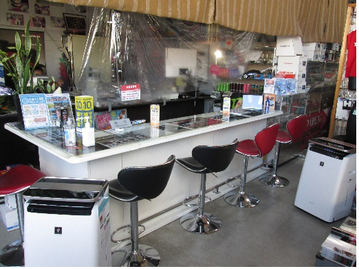 当店は、コロナウイルス対策の一環として『3密』を避けるために接客スペースを広く取り除菌アルコール消毒の徹底及び設置。
